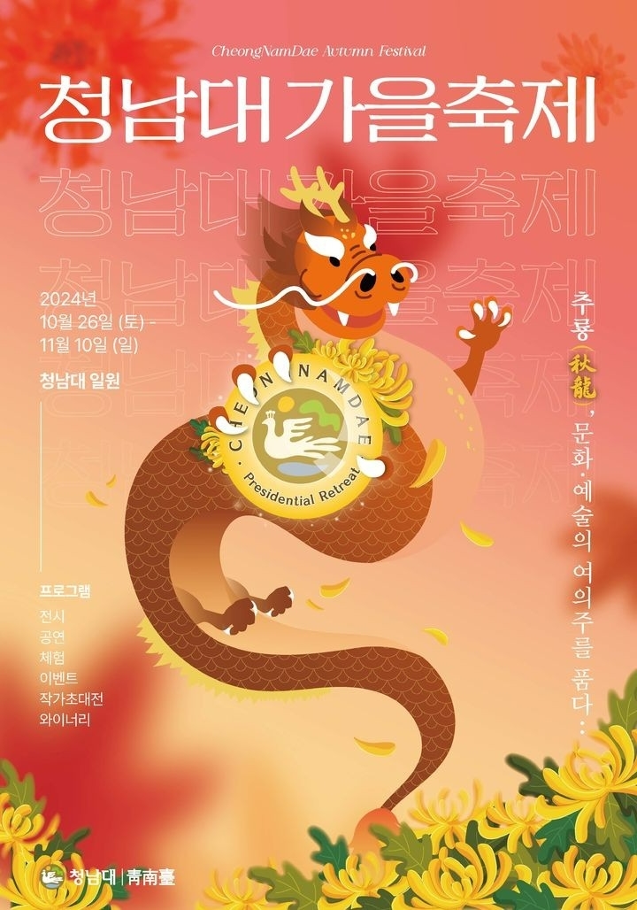 충남 태안군의 옛 대통령 별장 청남대에서 10월 26일부터 11월 10일까지 '2024 청남대 가을 축제'가 열린다. 이번 축제는 '추룡(秋龍), 문화·예술의 여의주를 품다'를 주제로, 국화 전시, 문화 공연, 체험 행사 등 다양한 프로그램이 마련된다.