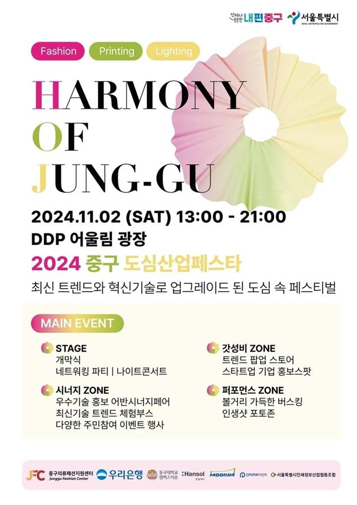 서울 중구(구청장 김길성)는 11월 2일 오후 1시부터 9시까지 동대문디자인플라자(DDP) 어울림광장에서 '2024 중구 도심산업 페스타'를 개최한다고 밝혔다. 이번 행사는 중구의 패션, 인쇄, 조명 등 도심산업의 우수성을 알리고 지역 산업 활성화를 도모하기 위해 마련됐다.