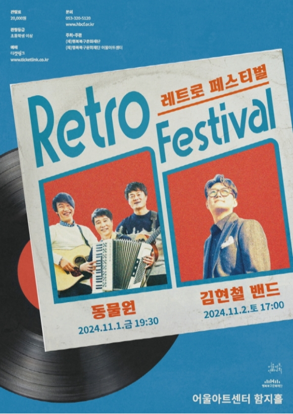 행복북구문화재단(대표 박정숙) 어울아트센터가 오는 11월 1일과 2일 양일간 어울아트센터 함지홀에서 2024 레트로 페스티벌을 개최하며, 가수 ‘동물원’과 ‘김현철 밴드’의 특별한 무대를 선보인다. 이번 레트로 페스티벌은 중장년층 관객들에게 과거의 추억을 소환함과 동시에 MZ세대에게는 레트로 감성을 전하며 전 세대를 아우르는 무대로 기대를 모은다.