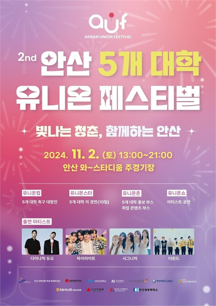 안산시는 내달 2일 와~스타디움에서 안산지역 5개 대학이 함께하는 ‘제2회 안산 유니온 페스티벌’을 개최한다고 28일 밝혔다. 이번 축제는 안산시와 대학 연합 학생 축제추진단, 안산인재육성재단이 공동 주관하며 ▲서울예술대학교 ▲신안산대학교 ▲안산대학교 ▲한국호텔관광전문학교 ▲한양대학교 ERICA 캠퍼스 등 지역 내 5개 대학이 참여한다.