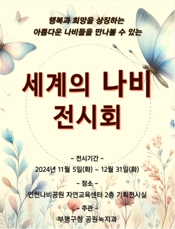 인천 부평구는 오는 11월 5일부터 12월 31일까지 부평숲 인천나비공원에서 ‘세계의 나비 전시회’를 개최한다고 밝혔다. 이번 전시회에서는 국내외 다채로운 나비들의 모습을 담은 나비공원의 자체 제작 표본들이 전시되어 관람객들을 맞이할 예정이다.