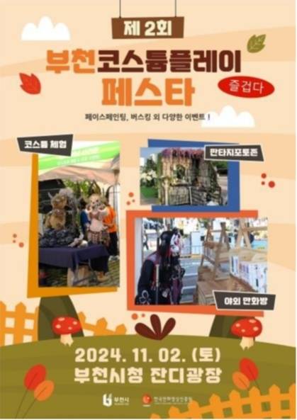 한국만화영상진흥원은 11월 2일 부천시청 앞 잔디광장에서 ‘제2회 부천 코스튬플레이페스타’를 개최한다고 밝혔다. 이번 행사는 시민들에게 코스튬플레이 체험과 다양한 만화 문화 경험을 제공하기 위해 마련됐다.