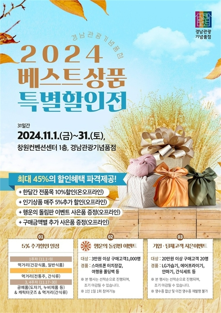 경남도와 경남관광재단은 11월 1일부터 한 달간 창원컨벤션센터 내 경남관광기념품점에서 가을맞이 특별할인 행사를 진행한다고 밝혔다.