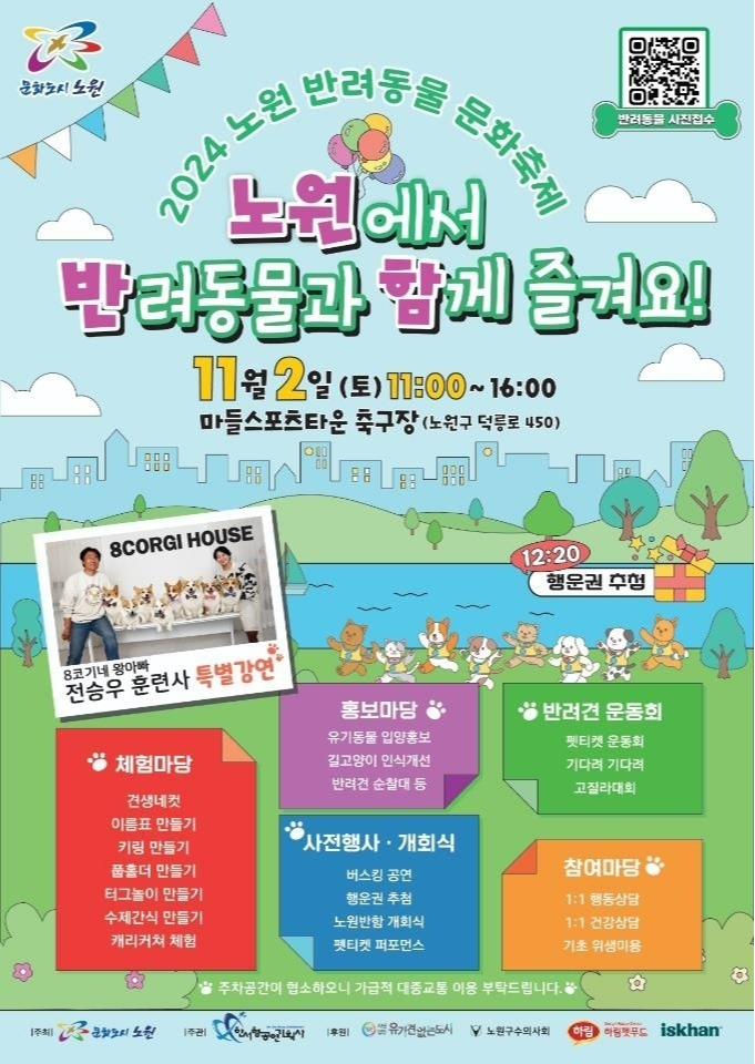 올해로 7회를 맞는 ‘노원반함’은 ‘사지 말고 입양해요’를 주제로, 유기동물 입양 문화를 확산하고 입양의 중요성을 알리기 위해 다채로운 프로그램을 준비했다. 특히 ‘펫티켓 운동회’에서는 견주와 반려견이 함께 참여할 수 있는 다양한 게임과 체험 행사가 진행되며, 반려견 전용 놀이터도 마련된다.