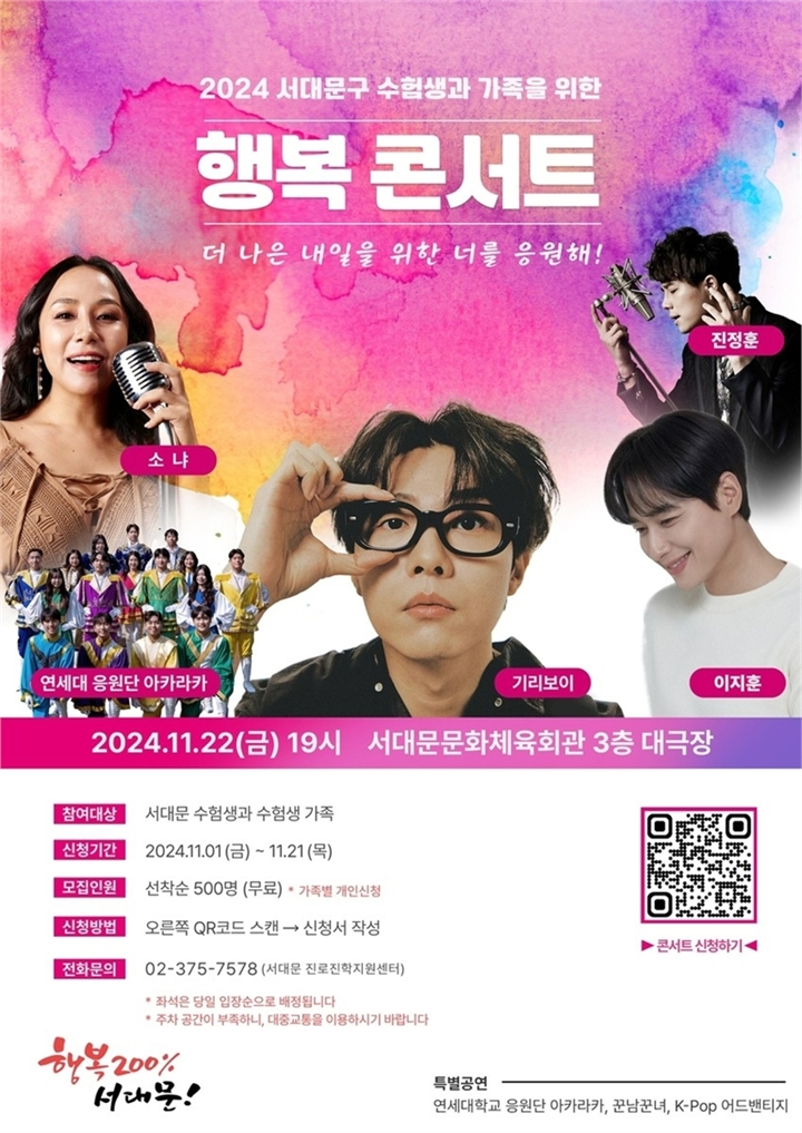 이날 공연에는 연세대학교 아카라카 응원단을 시작으로 가수 소냐, 이지훈, 기리보이, 진정훈 등이 무대에 올라 다채로운 공연을 선보인다. 무료로 진행되는 이 공연은 서대문구 진로진학지원센터 홈페이지를 통해 11월 1일부터 선착순 500명을 모집하며, 수능을 마친 고3 수험생을 비롯해 고1, 고2 학생들까지 신청할 수 있다.
