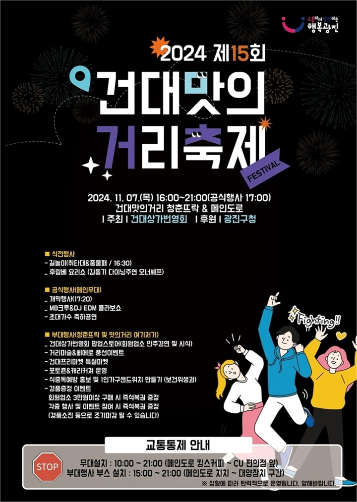서울 광진구(구청장 김경호)가 오는 7일 건대 청춘뜨락 일대에서 ‘2024 건대 맛의 거리 음식문화축제’를 개최한다고 1일 밝혔다. 올해로 15회를 맞는 이 축제는 건대상가번영회의 주관 아래 다양한 볼거리와 먹거리를 제공하며 지역 활성화를 도모한다.