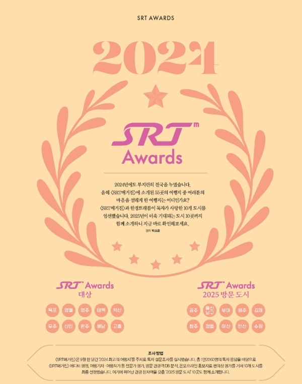 SRT매거진이 국내 여행 활성화를 목표로 선정하는 ‘SRT 어워드’의 2024년 최고의 여행지 10곳이 발표됐다. 2018년부터 시작된 이 어워드는 국내 다양한 매력을 지닌 여행지를 매년 선정하고 있다. 올해의 여행지에는 고흥, 목포, 무주, 신안, 영월, 영주, 완주, 익산, 태백, 해남이 이름을 올렸다.