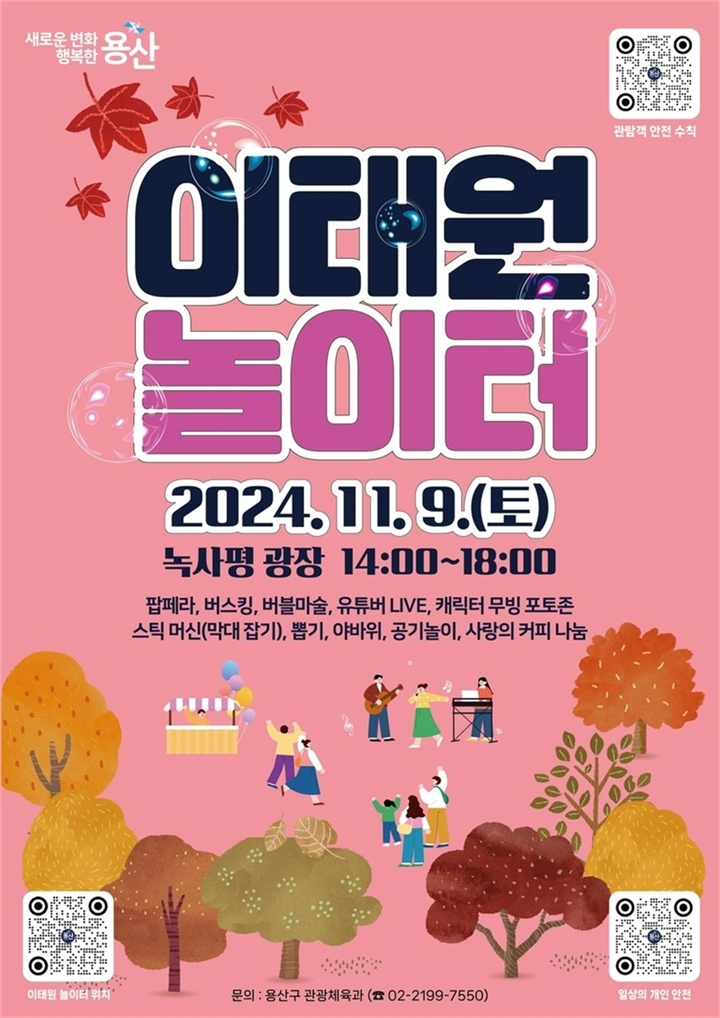 서울 용산구(구청장 박희영)는 오는 9일 이태원 관광특구 활성화를 위해 녹사평 광장 일대에서 '2024 이태원 놀이터' 행사를 개최한다고 밝혔다. 이날 행사는 오후 2시부터 6시까지 진행되며, 누구나 참여할 수 있도록 다양한 프로그램이 마련될 예정이다.