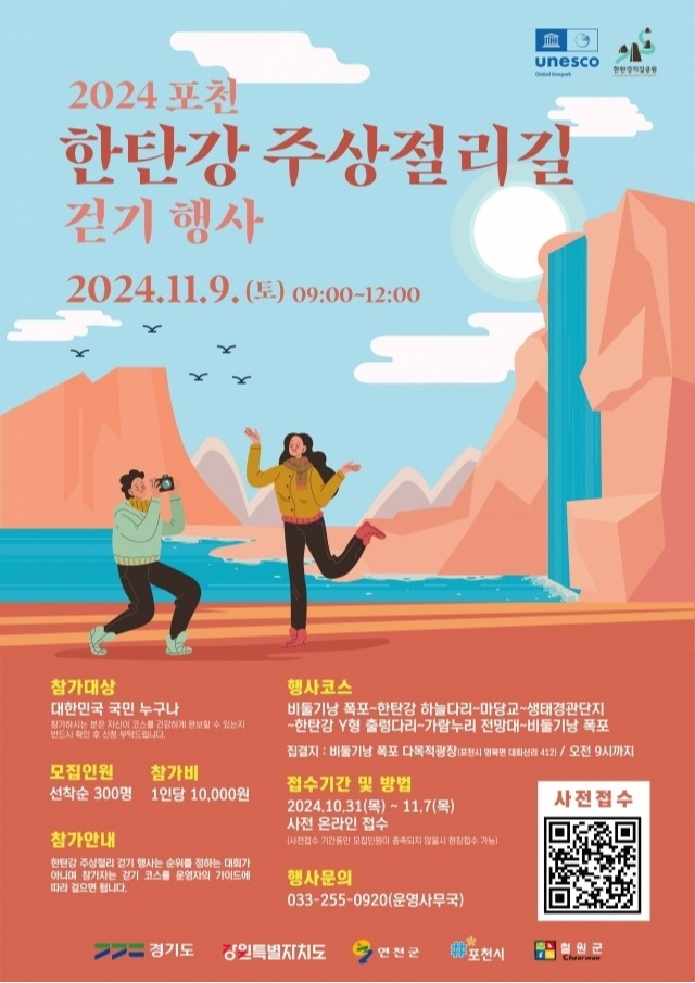 경기도 포천시는 오는 9일 오전 9시부터 12시까지 한탄강의 아름다운 경관을 따라 걷는 ‘한탄강 주상절리길 걷기 행사’를 개최한다. 이번 행사는 포천의 대표 관광명소인 비둘기낭 폭포, 한탄강 하늘다리, 한탄강 생태경관단지, 그리고 올해 새로 개통된 Y형 출렁다리를 포함한 다채로운 코스로 구성되어 참가자들에게 한탄강의 웅장한 절경과 단풍이 물든 가을 풍경을 만끽할 수 있는 기회를 제공한다.