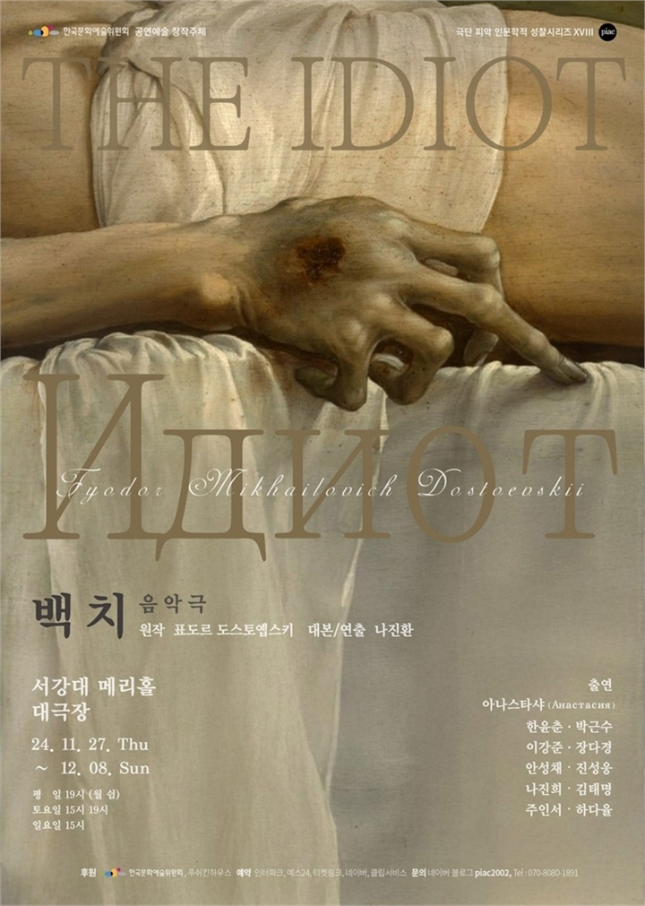러시아 대문호 표도르 도스토옙스키의 소설 백치가 음악극 형식으로 재탄생해 이달 27일부터 다음 달 8일까지 서울 서강대 메리홀 대극장에서 관객을 만난다. 이번 공연은 극단 피악의 나진환 연출이 죄와 벌, 악령, 카라마조프가의 형제들에 이어 도스토옙스키 4대 장편을 모두 무대화하는 의미 있는 시리즈의 마지막 작품이다.
