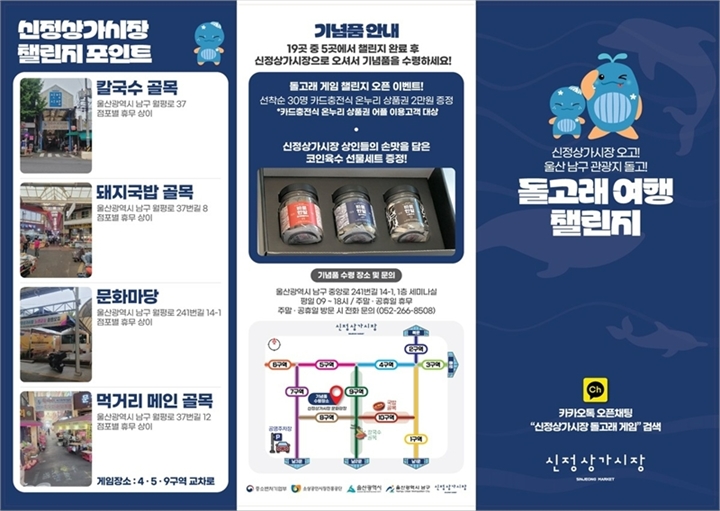 울산시 남구는 지역 전통시장인 신정상가시장과 주요 관광지를 연계한 돌고래 여행 챌린지를 운영한다고 밝혔다. 중소벤처기업부의 공모사업으로 추진되는 이번 프로그램은 신정상가시장을 문화관광형 시장으로 육성하기 위한 일환으로, 총 사업비 8억 원이 투입돼 올해부터 내년까지 이어질 예정이다.