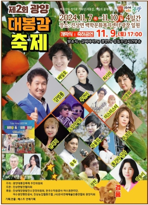 진상면은 백운산의 어치계곡과 불암산성, 농부네텃밭도서관이 자리한 곳으로, 광양 대봉감 축제가 열리며 다채로운 가을 축제로 활기를 더하고 있다. 이번 축제는 7일 개막해 오는 10일까지 이어지며, 광양 9미(味) 중 하나로 유명한 신선한 광양 대봉감을 저렴하게 만날 수 있는 직거래 장터가 마련됐다. 감 경매와 깎기 대회, 가요제 등 풍성한 볼거리와 함께 송아지 경품으로 시선을 끌고 있다.
