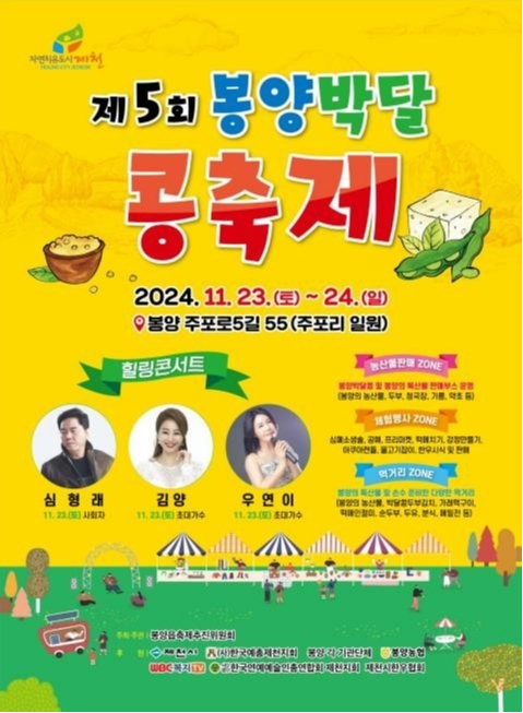 충북 제천시 봉양읍 주포리 문화복지센터에서 오는 11월 23일부터 24일까지 이틀간 ‘제5회 봉양 박달콩 축제’가 열린다. 봉양읍 콩축제추진위원회가 주관하고 제천시와 봉양농협이 후원하는 이번 축제는 지역 농가의 소득을 증대시키고, 고품질 지역 농산물을 널리 알리기 위해 기획됐다.
