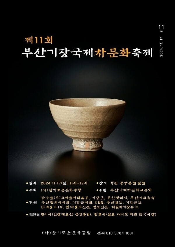 올해로 11회를 맞이한 부산기장국제차문화축제가 오는 17일 부산 기장군 정관읍 중앙공원에서 열린다. (사)향기로운문화동행(이사장 보혜 스님)이 주최하는 이번 축제는 외국 차에 밀려 점차 자리를 잃어가는 우리 전통 차의 우수성을 널리 알리고 차 문화를 보존하기 위해 마련되었다.