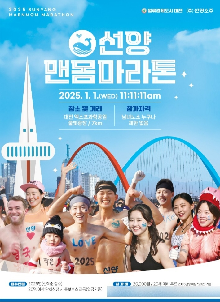 선양소주(회장 조웅래)가 새해를 맞아 특별한 이벤트 ‘2025 선양 맨몸마라톤’을 내년 1월 1일 대전엑스포과학공원 물빛광장에서 개최한다고 밝혔다. ‘선양 맨몸마라톤’은 매년 1월 1일 오전 11시 11분 11초에 출발해 대전 갑천변 7㎞를 웃통을 벗고 달리는 이색 축제로, 새해 첫날을 상징하는 숫자 ‘1’을 강조해 독특한 출발 시각을 유지하고 있다.