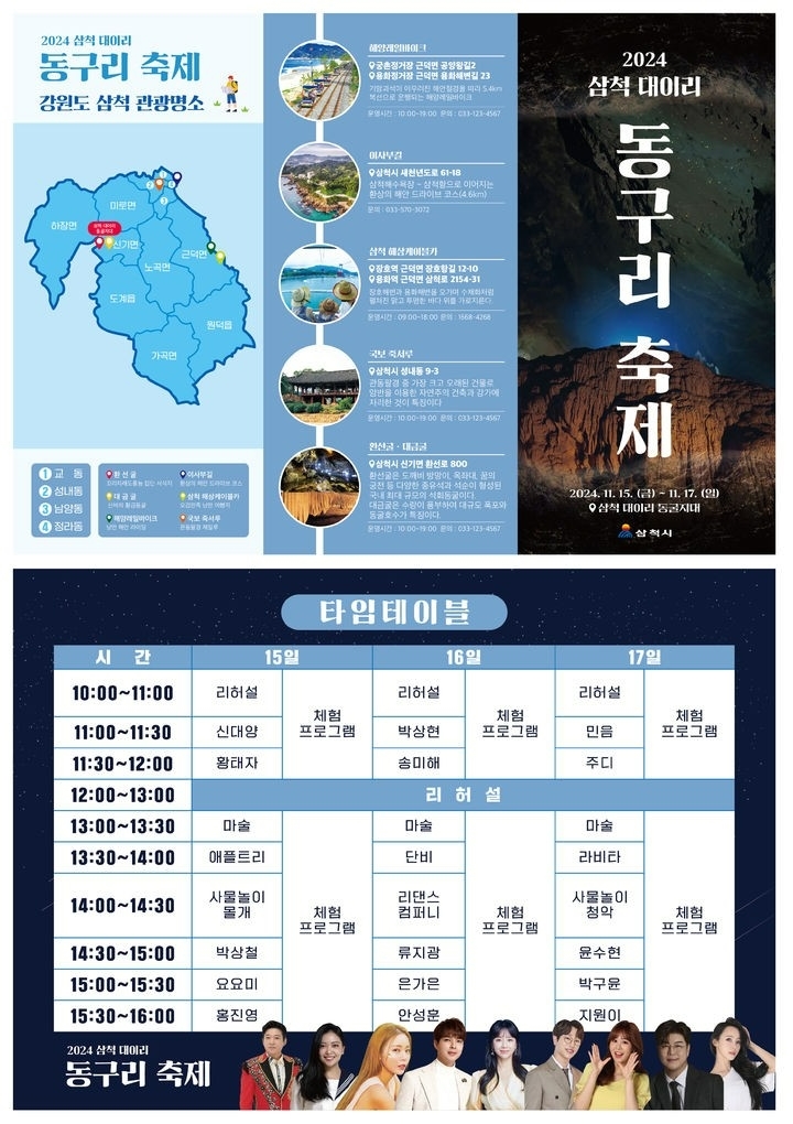 삼척시는 오는 15일부터 17일까지 대이리 동굴지대에서 ‘삼척 대이리 동구리 축제’를 개최한다고 밝혔다. 아시아 최대 석회동굴인 환선굴이 자리한 대이리 동굴지대(천연기념물 제178호)의 브랜드 가치를 널리 알리고 관광객 유치를 위해 마련된 이번 축제는 다채로운 공연과 체험 프로그램으로 풍성하게 꾸며질 예정이다.