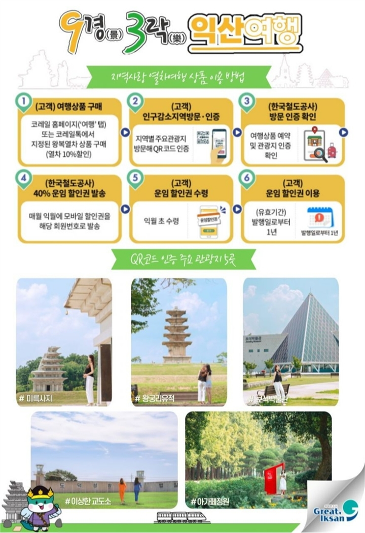 패키지여행으로는 ‘9경3락 익산기차여행’과 ‘렌터카타고 떠나는 익산 고백(GoBack) 여행’이 마련되어 있으며, 별도의 인증 절차 없이 열차 왕복 50% 할인 혜택과 다양한 추가 구성을 즐길 수 있다.
