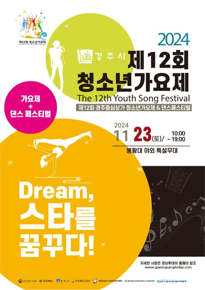 경주시는 오는 23일 봉황대 특설무대에서 ‘제12회 청소년 가요제 & 댄스페스티벌’을 개최한다. 이번 행사는 ‘2024 경주시 청소년 어울림마당’과 함께 열리며, 지역 중심상권에 활력을 불어넣고 청소년들의 꿈과 재능을 지원하기 위해 마련됐다.