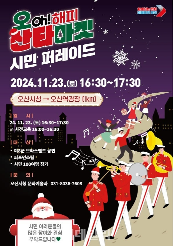 경기 오산시가 주최하는 겨울 축제 ‘산타마켓’이 오는 23일 화려한 거리 퍼레이드로 시작을 알린다. 이번 행사는 12월 29일까지 이어지며, 유럽형 크리스마스마켓을 모티브로 오산의 겨울 랜드마크 축제로 자리 잡기 위한 다채로운 프로그램으로 가득하다.