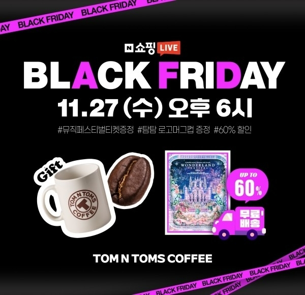 카페 탐앤탐스가 오는 11월 27일 오후 6시 네이버 쇼핑라이브를 통해 ‘블랙 프라이데이’ 특집 방송을 진행한다. 이번 쇼핑라이브는 원두, 커피용품, 머그 등 다양한 인기 상품을 최대 60% 할인된 가격으로 선보이며, 고객들에게 풍성한 혜택을 제공할 예정이다.