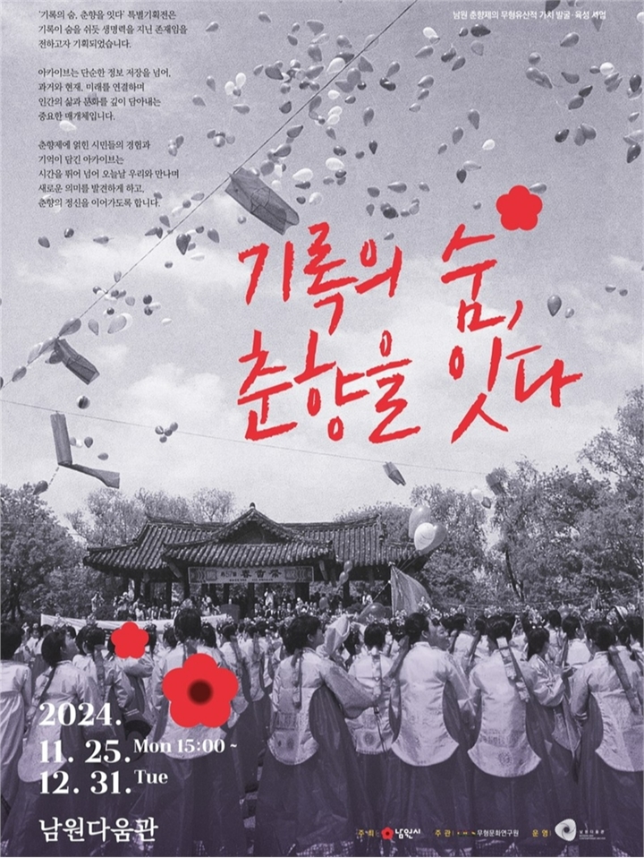 전북 남원시가 춘향과 춘향제의 유물과 기록을 한자리에 모은 전시회 ‘기록의 숨, 춘향을 잇다’를 남원다움관에서 연말까지 개최한다. 이번 전시회는 춘향과 춘향제가 한국인의 삶과 예술에 남긴 무형 유산적 가치를 조명하고 이를 널리 알리기 위해 마련됐다.