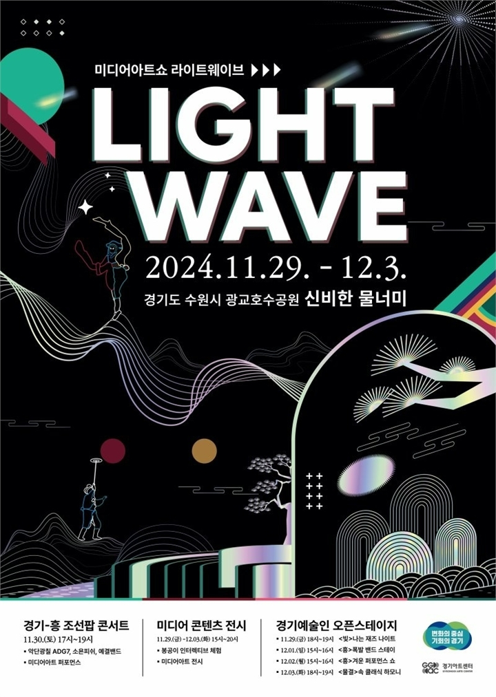 경기도가 오는 11월 29일부터 12월 3일까지 수원 광교호수공원 신비한 물너미 일대에서 ‘라이트 웨이브(LIGHT WAVE)’ 미디어아트쇼를 개최한다고 26일 밝혔다. 이번 행사는 ‘빛의 파동, 새로운 물결’이라는 주제로, 빛과 음악, 전통 공연예술이 어우러진 독창적인 문화예술을 선보인다.