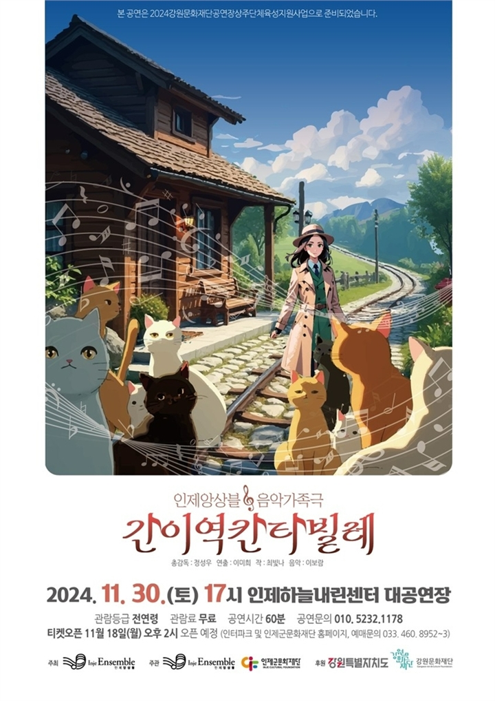 먼저, 30일에는 음악 가족극 ‘간이역칸타빌레’가 인제 하늘내린센터 대공연장에서 무대에 오른다. 이 작품은 폐쇄를 앞둔 간이역을 배경으로 동물과 사람, 그리고 소외되고 외로운 존재들이 서로를 의지하며 희망을 찾아가는 이야기를 따뜻한 선율과 함께 담아낸다. 삶의 의미를 되새기게 하는 감동적인 줄거리로 주민들에게 특별한 문화적 경험을 선사할 것으로 기대된다.