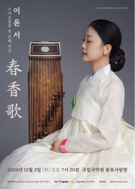 한편 이윤서 가야금병창 첫 번째 여정 ‘春香歌(춘향가)’는 2024년 청년예술지원사업 선정 프로젝트로 서울특별시, 서울문화재단의 후원과 함단아 한복의 협찬으로 개최되며, 공연은 전석 초대로 진행된다. 공연에 관한 자세한 정보는 국립국악원 누리집에서 확인할 수 있다.