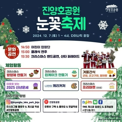 진주시 관계자는 “겨울의 문턱에서 진양호공원 눈꽃축제를 통해 시민들이 가족과 함께 추억을 만들고 한 해를 마무리하는 따뜻한 시간이 되길 바란다”며 “안전 관리와 행사 준비에 최선을 다해 시민들에게 잊지 못할 축제를 선사하겠다”고 밝혔다.