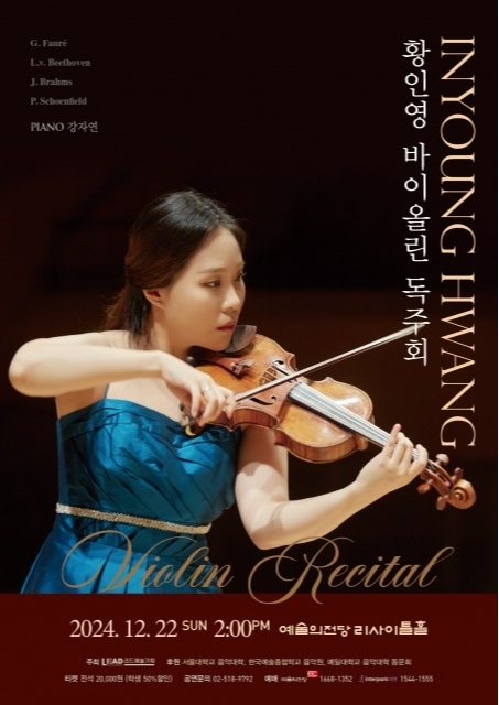 황인영 바이올린 독주회는 리드예술기획이 주최하며, 예술의전당과 인터파크 티켓을 통해 예매할 수 있다 (전석 2만원, 학생 1만원).