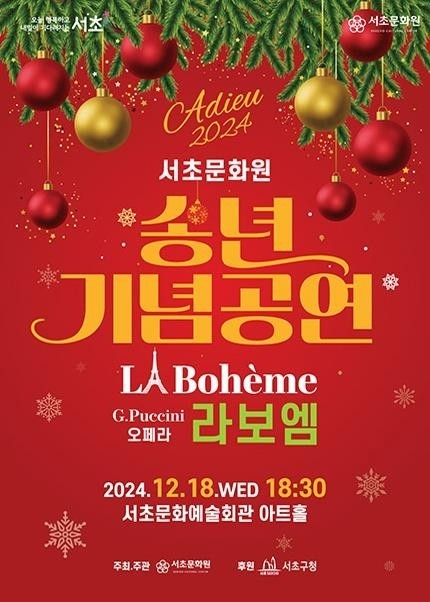 서울 서초구와 서초문화원이 오는 18일 서초문화예술회관에서 연말을 특별하게 장식할 ‘아듀 2024 송년기념공연’을 개최한다고 밝혔다. 이번 공연은 오페라 거장 푸치니의 서거 100주년을 기념하며, 크리스마스와 연말의 따뜻한 감성을 담은 명작 오페라 ‘라보엠’을 선보일 예정이다.