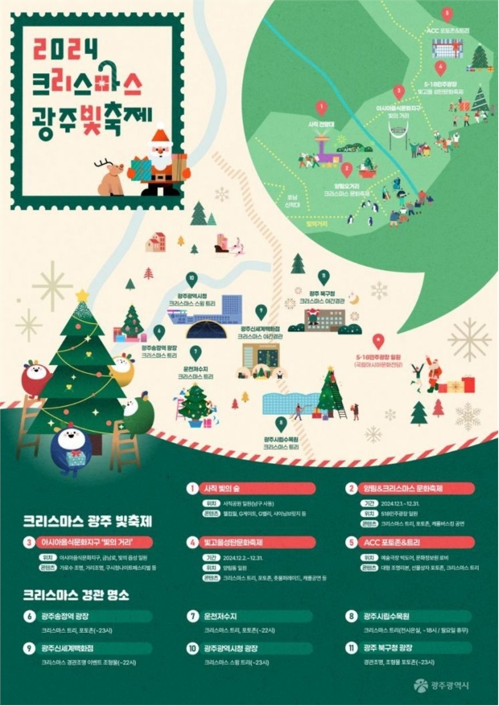 광주시는 연말연시를 맞아 겨울철 축제와 행사를 통합한 ‘2024 크리스마스 광주 빛축제’를 개최한다고 8일 밝혔다. 이번 축제는 사직동, 양림동, 아시아음식문화지구, 5·18민주광장 등 광주 주요 지역에서 펼쳐지며, 빛과 함께 다채로운 프로그램으로 시민과 관광객들에게 특별한 겨울을 선사할 예정이다.