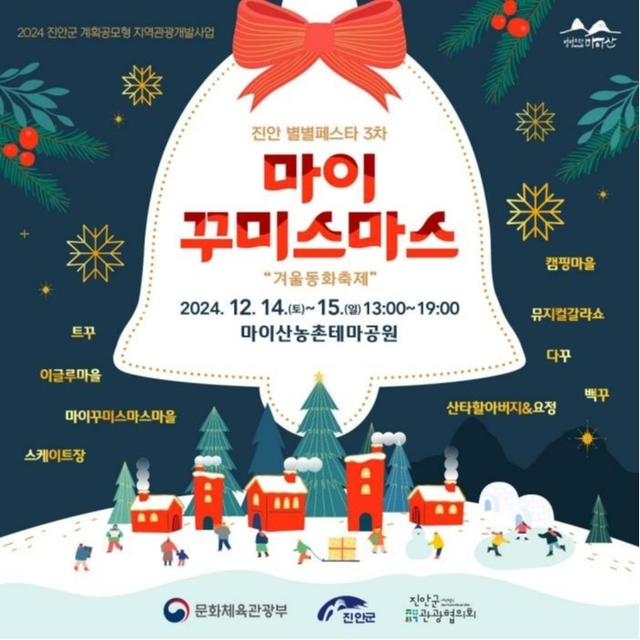 진안군 관광협의회는 오는 14일부터 15일까지 마이산 농촌테마공원 광장에서 ‘마이 꾸미스마스 동화축제’를 개최한다. 이번 행사는 ‘마이산에 종이 울리면 크리스마스 마을이 나타난다!’라는 주제로 겨울 동화 속 마법 같은 시간을 선사할 예정이다.