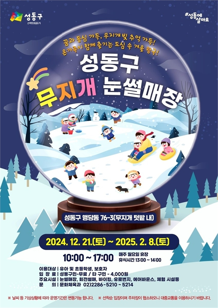 정원오 성동구청장은 “성동 무지개 눈썰매장은 도심 속에서 아이들과 가족들이 함께 겨울을 만끽할 수 있는 특별한 공간”이라며 “앞으로도 유휴공간을 활용해 주민들이 여가와 문화를 즐길 수 있는 다양한 프로그램을 마련하겠다”고 말했다.
