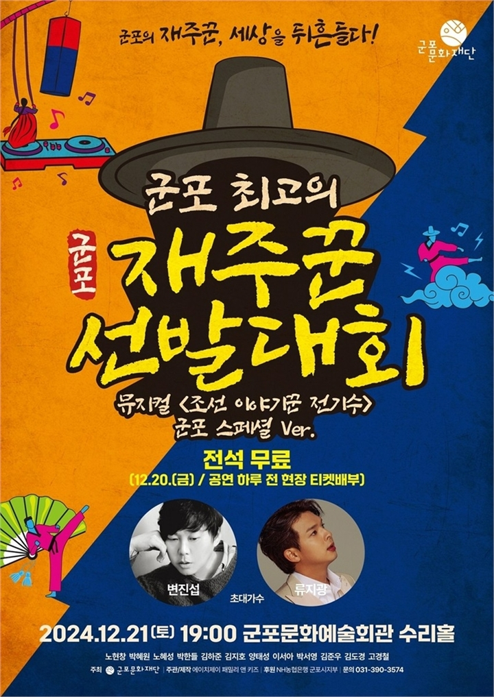 군포문화재단은 오는 21일 오후 7시 군포문화예술회관에서 군포 최고의 재주꾼 선발대회 본선 무대를 개최한다고 밝혔다. 이 행사는 시민들의 숨겨진 끼와 재능을 발굴하고 함께 성장할 수 있는 기회를 제공하기 위해 마련된 시민 참여형 공연 프로그램이다.