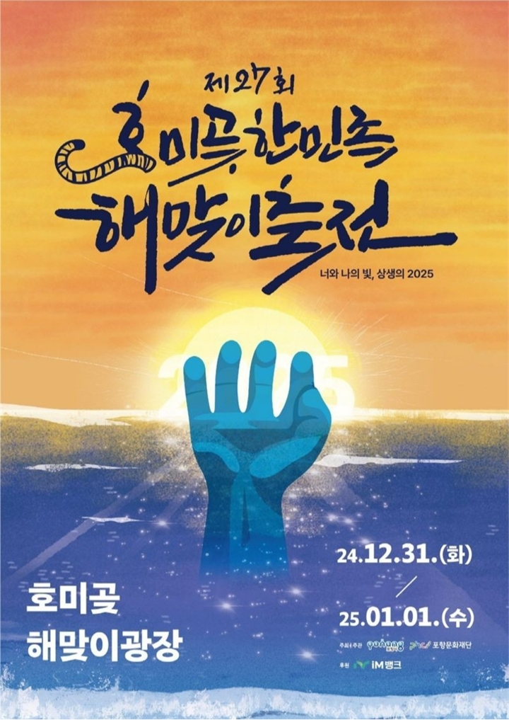 경북 포항문화재단이 오는 12월 31일부터 1월 1일까지 호미곶에서 ‘제27회 호미곶한민족해맞이축전’을 개최하며, 2025년 을사년 새해를 맞이하는 특별한 축제를 준비한다. 이번 축제는 ‘너와 나의 빛, 상생의 2025’를 슬로건으로 삼아 더욱 풍성하고 다채로운 프로그램으로 관광객과 시민들을 맞이할 예정이다.