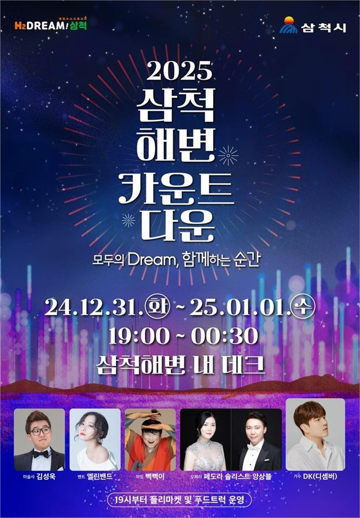 강원특별자치도 삼척시는 2024년 12월 31일 밤 7시부터 2025년 1월 1일 새벽 0시 30분까지 삼척 해변 데크에서 ‘2025 삼척해변 카운트다운 페스티벌’을 개최한다고 밝혔다. 이번 페스티벌은 ‘모두의 Dream, 함께하는 순간’이라는 주제로, 한 해를 마무리하고 새해를 맞이하는 시민과 관광객들에게 특별한 추억을 선사할 예정이다.