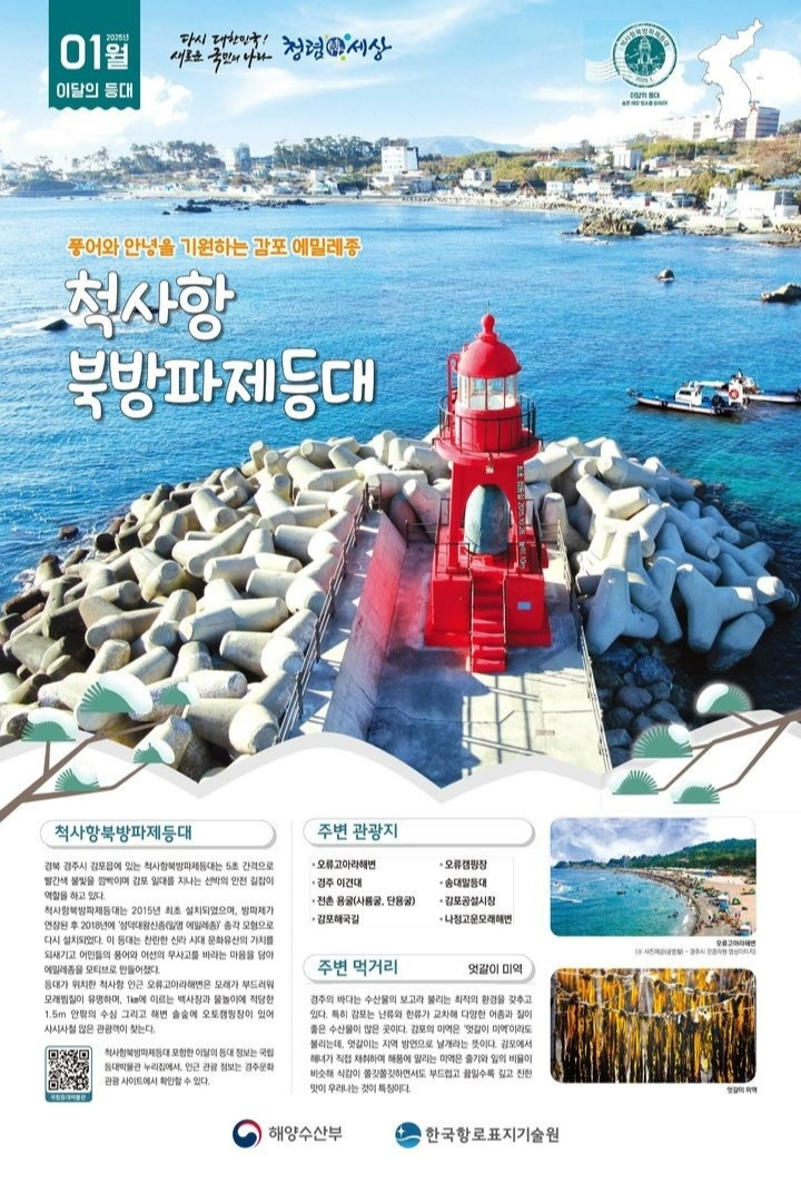 해양수산부는 1월 이달의 등대로 경북 경주시 감포읍에 위치한 척사항 북방파제등대를 선정했다고 밝혔다. 이 등대는 5초 간격으로 붉은 불빛을 깜빡이며 감포 일대를 항해하는 선박들에게 안전한 길잡이 역할을 하고 있다.