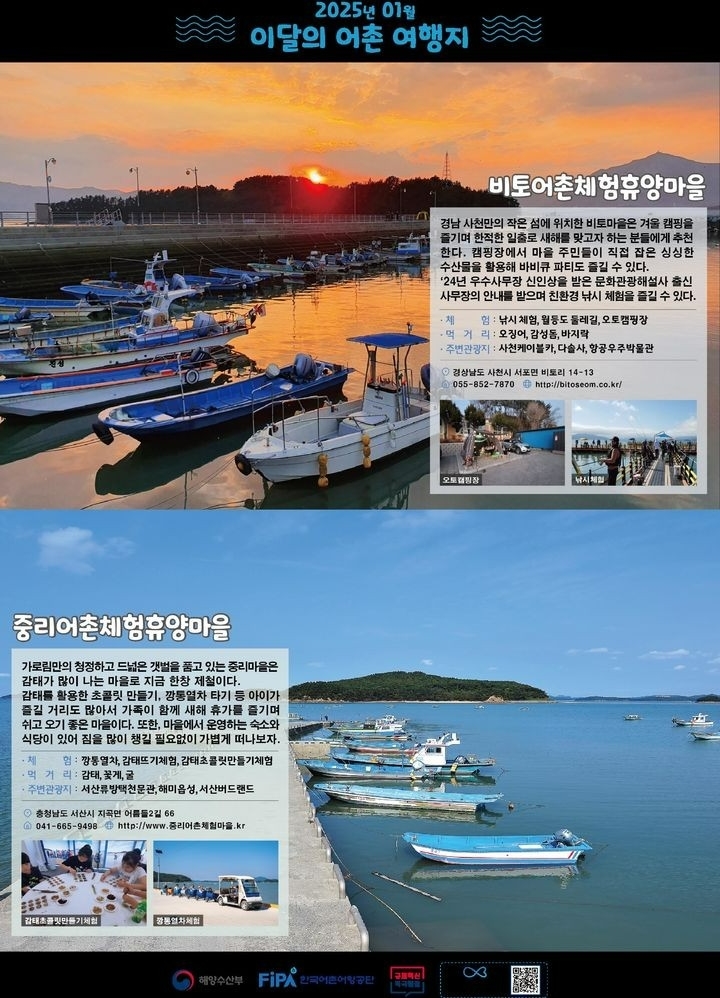 해양수산부는 1월 이달의 어촌 여행지로 경남 사천시 비토마을과 충남 서산시 중리마을을 선정했다고 밝혔다. 두 마을은 자연의 아름다움과 다양한 체험 프로그램을 통해 겨울철 특별한 추억을 선사하는 여행지로 주목받고 있다.