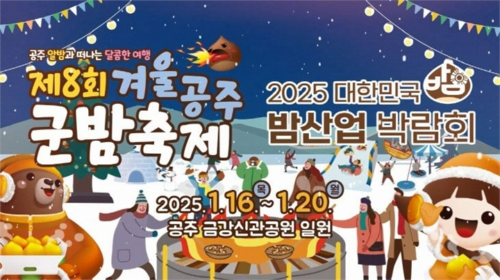중부권을 대표하는 겨울 축제 ‘겨울공주 군밤축제’가 알밤의 고장 공주에서 1월 16일부터 20일까지 5일간 공주 금강신관공원 일원에서 열린다. 올해로 8회를 맞이하는 이 축제는 ‘공주 알밤과 떠나는 달콤한 여행’을 주제로 공주 알밤의 우수성을 널리 알리고, 다양한 체험과 즐길 거리를 제공할 예정이다.
