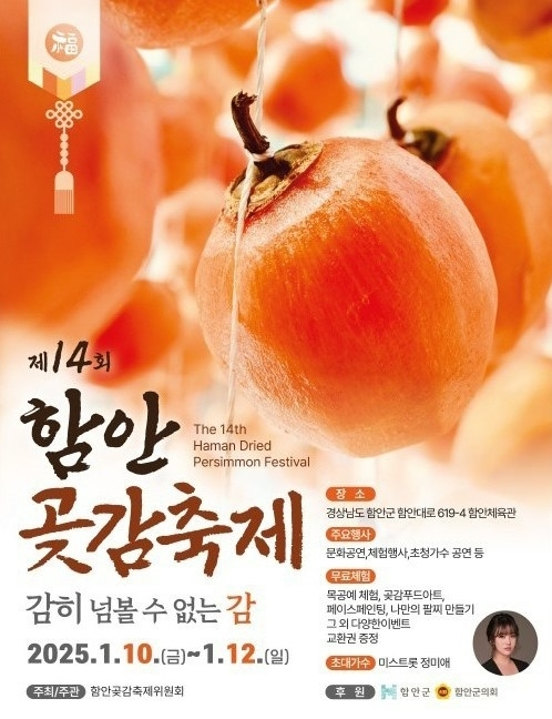 경남 함안군은 오는 10일부터 12일까지 함안체육관에서 ‘제14회 함안곶감축제’를 개최한다고 8일 밝혔다. 이번 축제는 ‘감히 넘볼 수 없는 감’이라는 주제로 함안곶감축제위원회가 주관하며, 다양한 프로그램과 체험행사로 겨울철 대표 간식인 함안곶감의 매력을 알릴 예정이다.