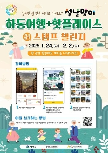 하동군이 임시공휴일 지정으로 길어진 설 연휴(1월 24일~2월 2일)를 맞아 관광객들을 대상으로 모바일 스탬프 챌린지 이벤트를 진행한다고 밝혔다. 이번 이벤트는 하동군의 대표 관광지와 핫플레이스를 방문하며 즐길 수 있는 색다른 경험을 선사할 예정이다.