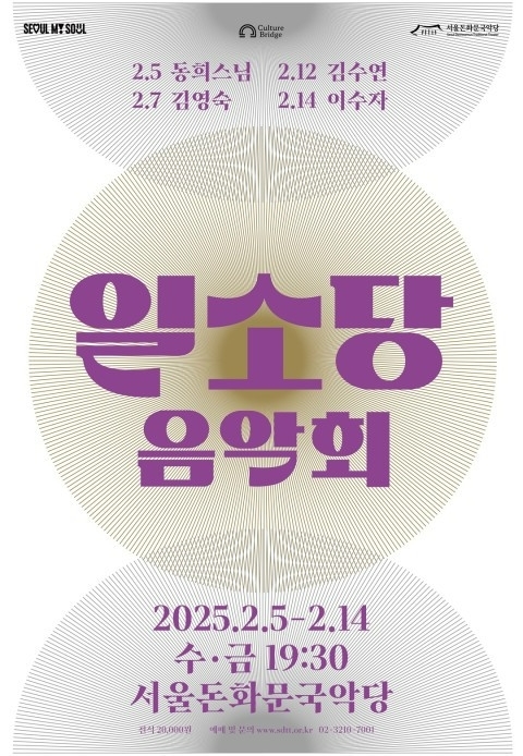 ‘일소당음악회’ 티켓은 전석 2만원이며 을사년 새해를 맞이해 뱀띠년 출생자는 40% 할인된 금액으로 상시 예매가 가능하다. 예매 및 자세한 내용 확인은 서울돈화문국악당 누리집(https://www.sdtt.or.kr)을 통해 가능하며 회차별 잔여 티켓이 있는 경우 공연 당일 현장 매표 후 관람할 수 있다. 기타 문의사항은 서울돈화문국악당으로 연락하면 된다.