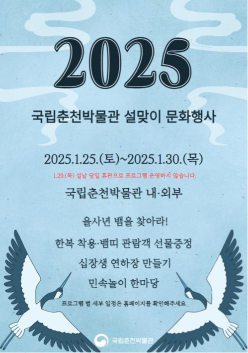설 당일인 29일은 휴관하며, 자세한 행사 일정과 내용은 국립춘천박물관 누리집에서 확인할 수 있다.