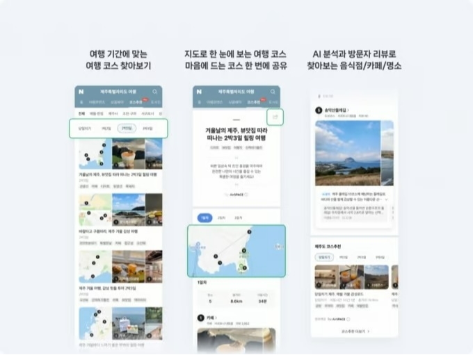 네이버는 국내 여행객을 위한 ‘국내 여행 코스 추천’ 서비스도 선보인다. AI 기반 장소 추천 시스템인 ‘에어스페이스(AiRSPACE)’를 활용해 국내 약 270개 지역을 코스 형식으로 추천하며, △연휴 동안 가기 좋은 여행지 △겨울 가족여행 추천지 △설경 명소 등 다양한 주제의 콘텐츠를 제공하는 #황금연휴 서비스도 함께 운영한다.
