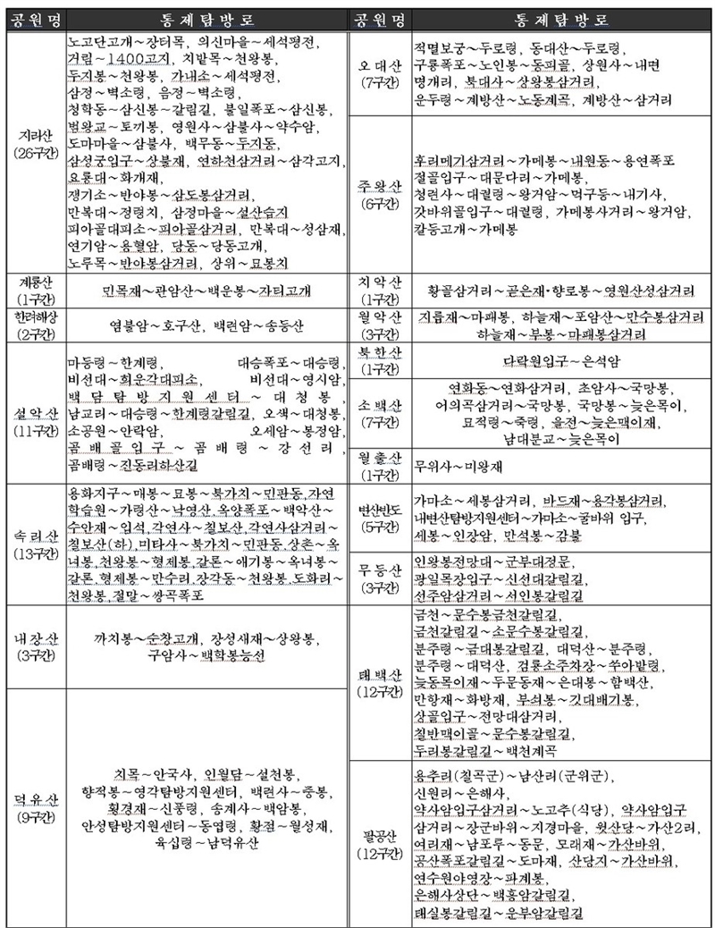 통제되는 탐방로에 대한 상세 정보는 국립공원공단 홈페이지(www.knps.or.kr)에서 확인할 수 있다.