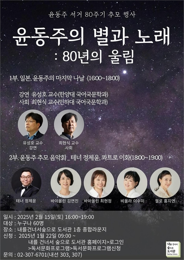 서울 은평구(구청장 김미경)는 윤동주 시인의 서거 80주기를 맞아 오는 15일 오후 4시 ‘내를 건너서 숲으로 도서관’에서 ‘윤동주 별과 노래: 80년의 울림’을 주제로 추모 행사를 연다고 밝혔다.