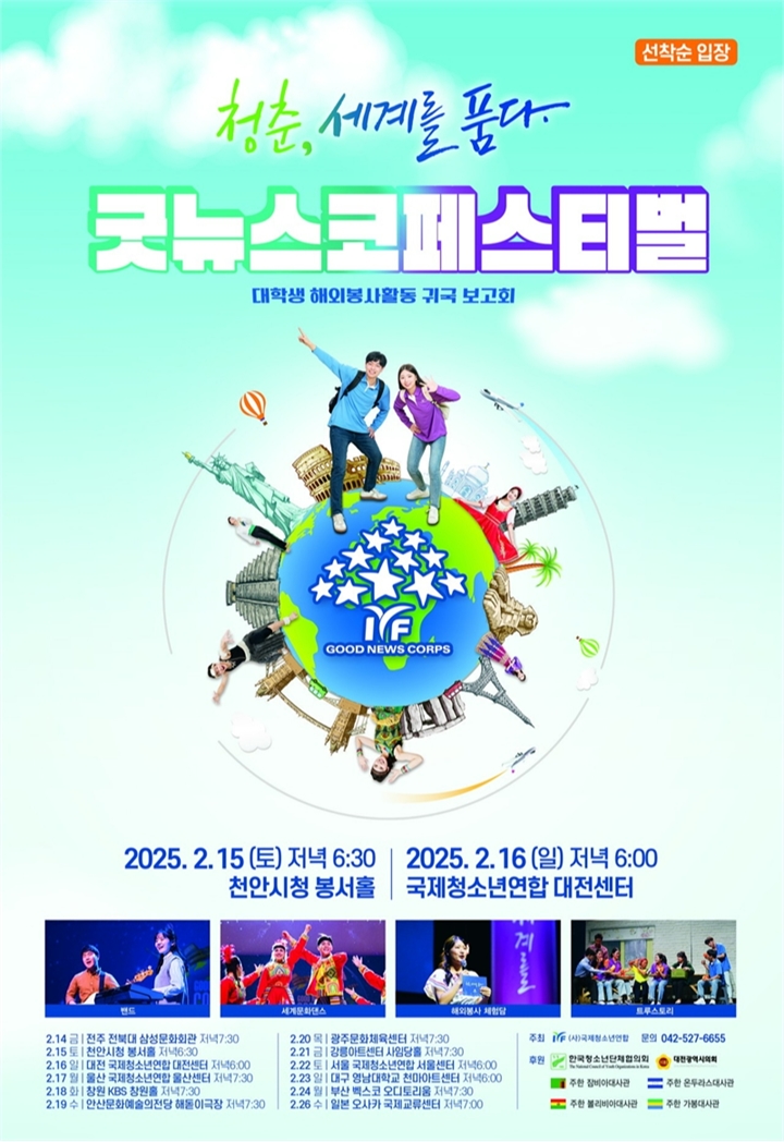 국제청소년연합(IYF)이 주최하는 ‘2025 굿뉴스코 페스티벌’이 오는 14일 전북대학교 삼성문화회관에서 개막한다. ‘청춘, 세계를 품다’를 슬로건으로 내건 이번 행사는 1년간 해외 봉사활동을 마치고 돌아온 국내 대학생들이 직접 기획하고 참여하는 국내 유일의 해외봉사 귀국 콘서트다.