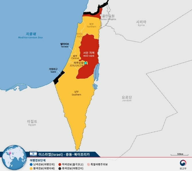 외교부는 이스라엘 일부 지역에 대한 여행경보를 12일부터 3단계인 ‘출국 권고’에서 2단계인 ‘여행 자제’로 하향 조정한다고 11일 발표했다. 이번 조치는 이스라엘의 현지 정세와 치안 상황이 개선된 점을 반영해 이루어졌다.