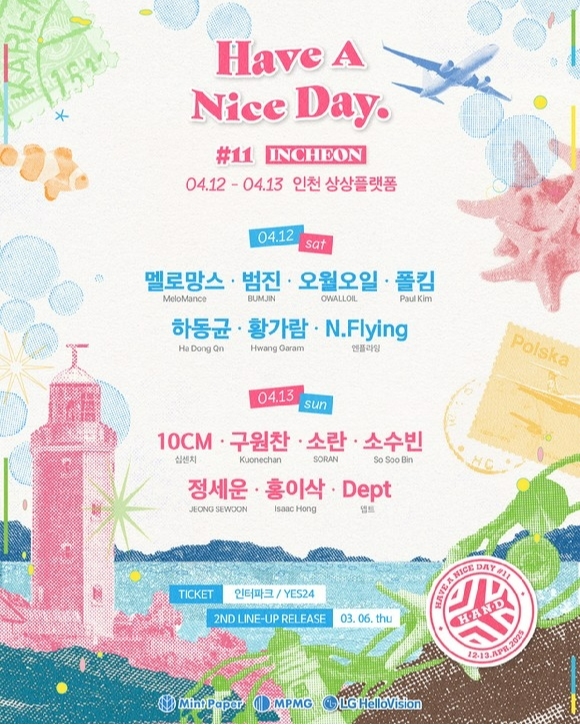 뮤직 페스티벌 ‘Have A Nice Day #11 – INCHEON’(이하 해브어나이스데이)이 오는 4월 12일부터 13일까지 양일간 인천 상상플랫폼에서 열린다. 이번 행사는 두 개의 스테이지에서 국내 최정상 아티스트들과 떠오르는 신예들이 총출동하는 풍성한 라인업으로 기대를 모은다.